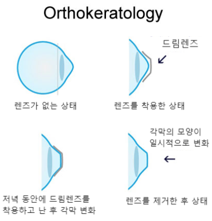 드림렌즈는 일시적으로 각막을 평평하게 만들어 시력을 교정하며 렌즈를 뺀 후에도 일정 시간 동안 교정효과가 유지되지만 하루정도 지속되고 착용하지 않으면 다시 돌아가게 됩니다.