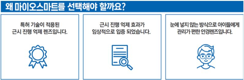 마이오스마트 렌즈란? 한번 진행된 근시는 회복이 불가합니다. 처음부터 예방하고 억제하고, 치료하는 게 가장 중요합니다. 마이오스마트는 식약처로부터 의료기기 신고가 아닌 허가를 받은만