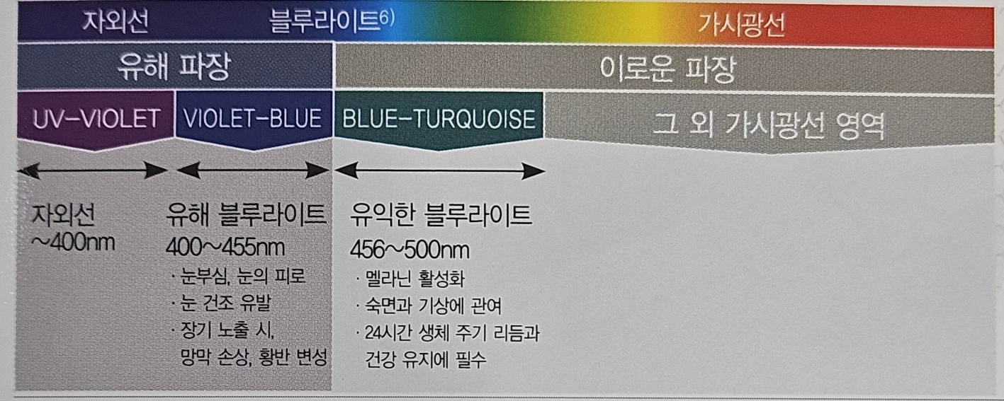 블루라이트 중 380 ~ 460nm의 파장은 시력저하와 눈의 피로, 안구 건조감 유발, 장기간 노출 시 망막 손상과 황반 변성 위험증가 등이 있습니다.