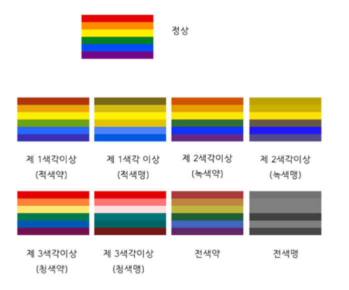 색상을 구별할 수 없고 흑백 TV처럼 명도만 구분할 수 있습니다.