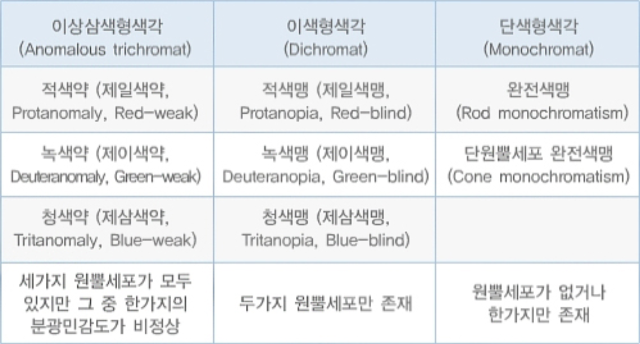 이런 원추세포에 이상이 생기면 빨강, 녹색, 파랑 중 색을 인지하지 못하는 색각이상 증상이 나타납니다.