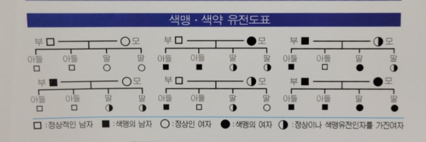 위 도표에서 보이듯 엄마가 색각이상이 있는 경우 아들은 100% 유전되는 걸 알 수 있습니다.