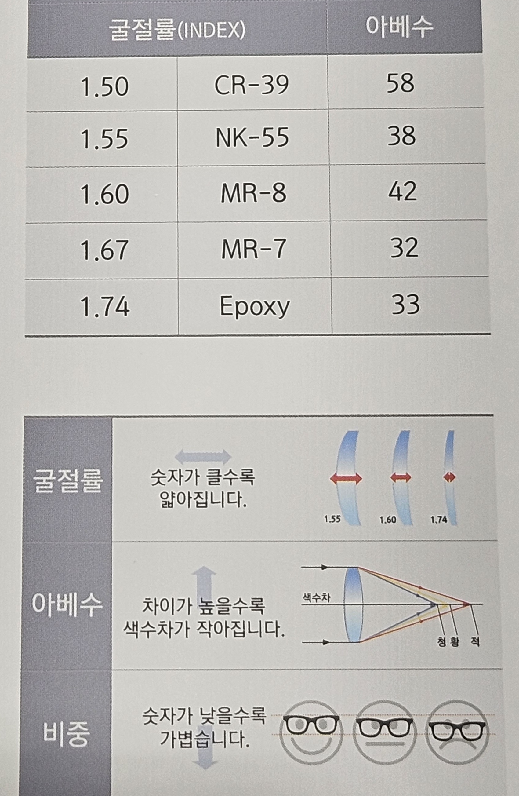 따라서 낮은 굴절률렌즈일수록 렌즈가 두껍고 높을수록 얇은 렌즈가 나옵니다.