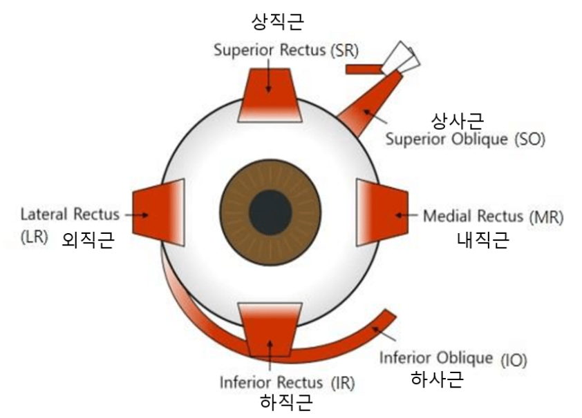 - 외직근(Lateral Rectus Muscle): 눈을 바깥쪽(귀 쪽)으로 움직이게 하는 주된 작용을 합니다.