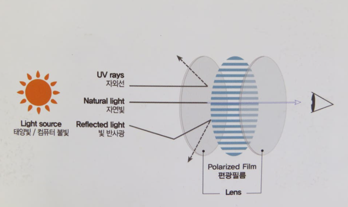 편광 선글라스 렌즈는 수직과 수평 편광으로 나눌 수 있고 눈부심 차단 여부는 축 설계에 달려있습니다.